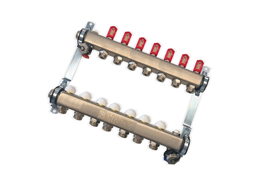 Colector compacto de siete salidas en acero inoxidable con caudalímetro.