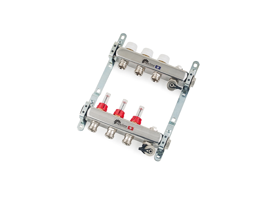 Robusto colector de tres salidas en acero inoxidable con caudalímetro.