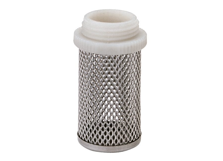 Malla filtrante para aspiración construida en acero inoxidable sobre soporte de polímero roscado.